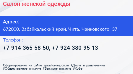 Салон женской одежды по адресу 672000, Забайкальский край, Чита, Чайковского, 37 в дальнейшем Организация, размещена в следующих категориях: