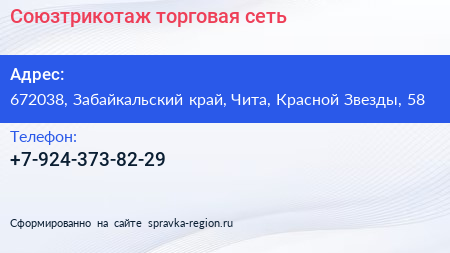 Союзтрикотаж, торговая сеть по адресу 672038, Забайкальский край, Чита, Красной Звезды, 58 в дальнейшем Организация, размещена в следующих категориях: