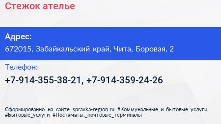 Стежок, ателье по адресу 672015, Забайкальский край, Чита, Боровая, 2 в дальнейшем Организация, размещена в следующих категориях: