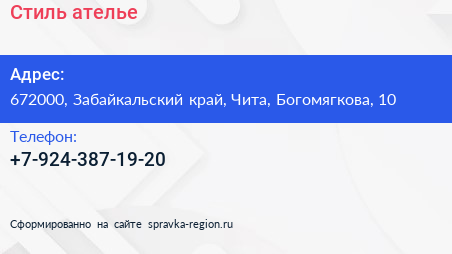 Стиль, ателье по адресу 672000, Забайкальский край, Чита, Богомягкова, 10 в дальнейшем Организация, размещена в следующих категориях: