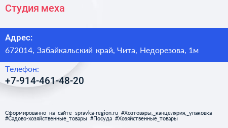 Студия меха по адресу 672014, Забайкальский край, Чита, Недорезова, 1м в дальнейшем Организация, размещена в следующих категориях: