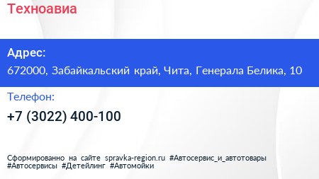 Техноавиа по адресу 672000, Забайкальский край, Чита, Генерала Белика, 10 в дальнейшем Организация, размещена в следующих категориях: