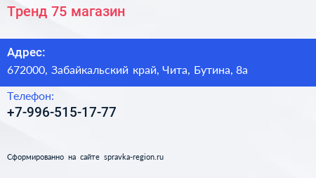 Тренд 75, магазин по адресу 672000, Забайкальский край, Чита, Бутина, 8а в дальнейшем Организация, размещена в следующих категориях:
