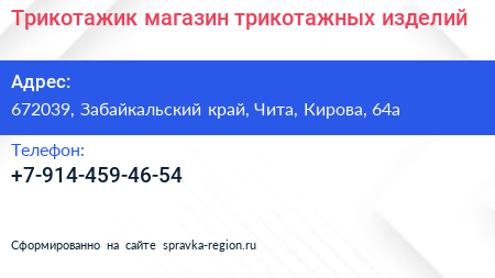 Трикотажик, магазин трикотажных изделий по адресу 672039, Забайкальский край, Чита, Кирова, 64а в дальнейшем Организация, размещена в следующих категориях:
