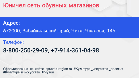 Юничел, сеть обувных магазинов по адресу 672000, Забайкальский край, Чита, Чкалова, 145 в дальнейшем Организация, размещена в следующих категориях: