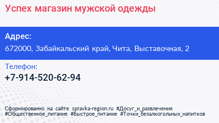 Успех, магазин мужской одежды по адресу 672000, Забайкальский край, Чита, Выставочная, 2 в дальнейшем Организация, размещена в следующих категориях: