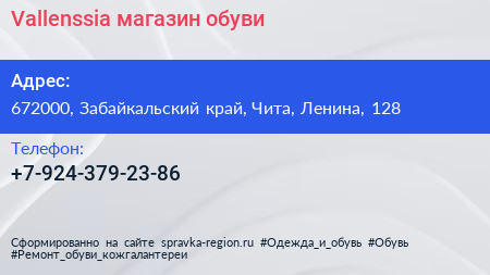 Vallenssia, магазин обуви по адресу 672000, Забайкальский край, Чита, Ленина, 128 в дальнейшем Организация, размещена в следующих категориях: