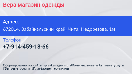 Вера, магазин одежды по адресу 672014, Забайкальский край, Чита, Недорезова, 1м в дальнейшем Организация, размещена в следующих категориях: