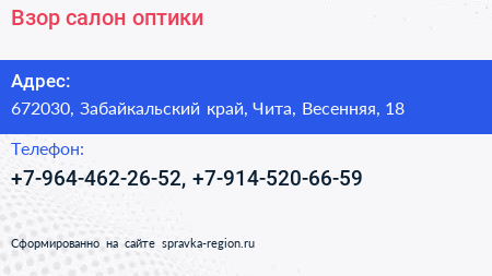 Взор, салон оптики по адресу 672030, Забайкальский край, Чита, Весенняя, 18 в дальнейшем Организация, размещена в следующих категориях: