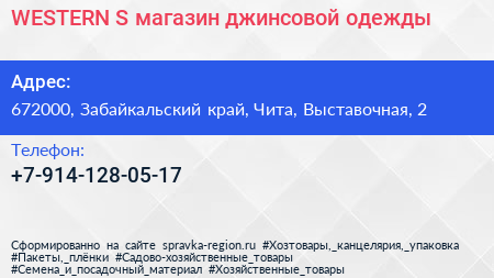 WESTERN-S, магазин джинсовой одежды по адресу 672000, Забайкальский край, Чита, Выставочная, 2 в дальнейшем Организация, размещена в следующих категориях: