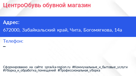 ЦентроОбувь, обувной магазин по адресу 672000, Забайкальский край, Чита, Богомягкова, 14а в дальнейшем Организация, размещена в следующих категориях: