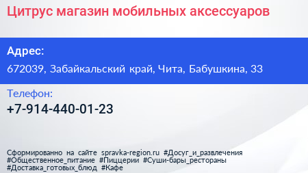 Цитрус, магазин мобильных аксессуаров по адресу 672039, Забайкальский край, Чита, Бабушкина, 33 в дальнейшем Организация, размещена в следующих категориях: