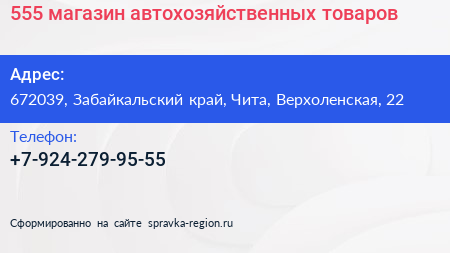 555, магазин автохозяйственных товаров по адресу 672039, Забайкальский край, Чита, Верхоленская, 22 в дальнейшем Организация, размещена в следующих категориях: