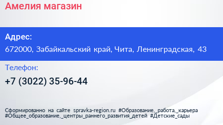 Амелия, магазин по адресу 672000, Забайкальский край, Чита, Ленинградская, 43 в дальнейшем Организация, размещена в следующих категориях: