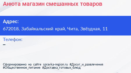 Анюта, магазин смешанных товаров по адресу 672018, Забайкальский край, Чита, Звёздная, 11 в дальнейшем Организация, размещена в следующих категориях: