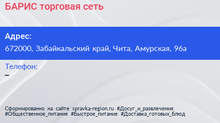 БАРИС, торговая сеть по адресу 672000, Забайкальский край, Чита, Амурская, 96а в дальнейшем Организация, размещена в следующих категориях: