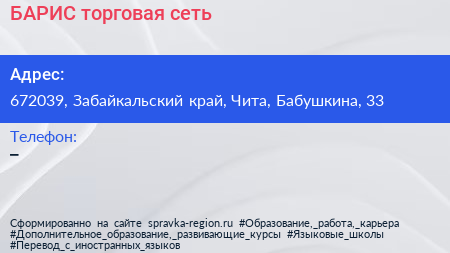 БАРИС, торговая сеть по адресу 672039, Забайкальский край, Чита, Бабушкина, 33 в дальнейшем Организация, размещена в следующих категориях: