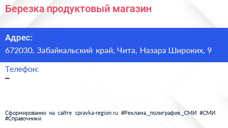 Березка, продуктовый магазин по адресу 672030, Забайкальский край, Чита, Назара Широких, 9 в дальнейшем Организация, размещена в следующих категориях: