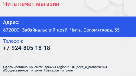 Чита печёт, магазин по адресу 672000, Забайкальский край, Чита, Богомягкова, 55 в дальнейшем Организация, размещена в следующих категориях: