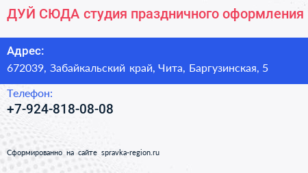ДУЙ СЮДА!, студия праздничного оформления по адресу 672039, Забайкальский край, Чита, Баргузинская, 5 в дальнейшем Организация, размещена в следующих категориях: