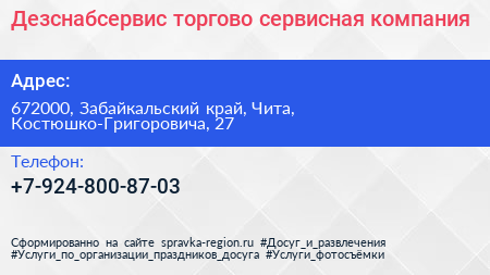 Дезснабсервис, торгово-сервисная компания по адресу 672000, Забайкальский край, Чита, Костюшко-Григоровича, 27 в дальнейшем Организация, размещена в следующих категориях: