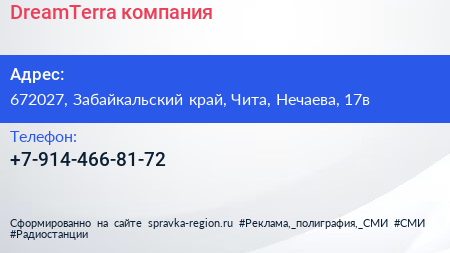 DreamTerra, компания по адресу 672027, Забайкальский край, Чита, Нечаева, 17в в дальнейшем Организация, размещена в следующих категориях: