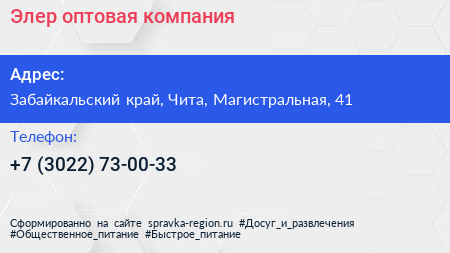 Элер, оптовая компания по адресу Забайкальский край, Чита, Магистральная, 41 в дальнейшем Организация, размещена в следующих категориях: