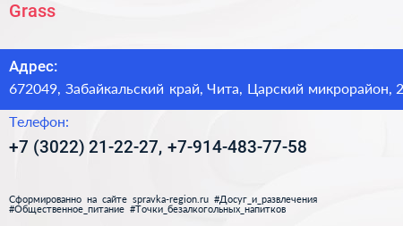 Grass по адресу 672049, Забайкальский край, Чита, Царский микрорайон, 2 в дальнейшем Организация, размещена в следующих категориях: