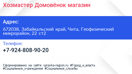 Хозмастер Домовёнок, магазин по адресу 672038, Забайкальский край, Чита, Геофизический микрорайон, 22 ст2 в дальнейшем Организация, размещена в следующих категориях: