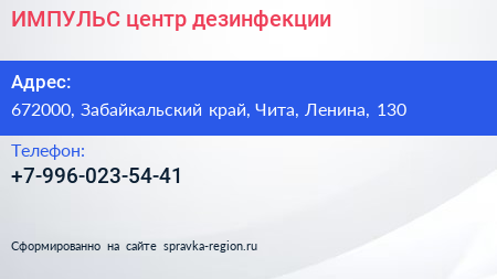 ИМПУЛЬС, центр дезинфекции по адресу 672000, Забайкальский край, Чита, Ленина, 130 в дальнейшем Организация, размещена в следующих категориях: