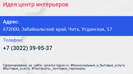 Идея, центр интерьеров по адресу 672000, Забайкальский край, Чита, Угданская, 17 в дальнейшем Организация, размещена в следующих категориях: