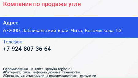 Компания по продаже угля по адресу 672000, Забайкальский край, Чита, Богомягкова, 53 в дальнейшем Организация, размещена в следующих категориях: