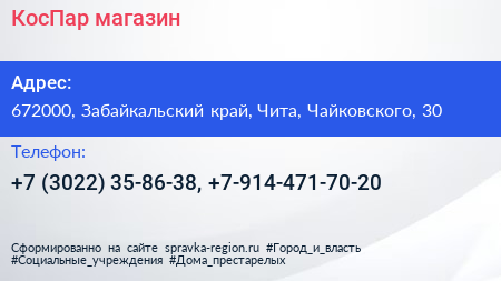 КосПар, магазин по адресу 672000, Забайкальский край, Чита, Чайковского, 30 в дальнейшем Организация, размещена в следующих категориях: