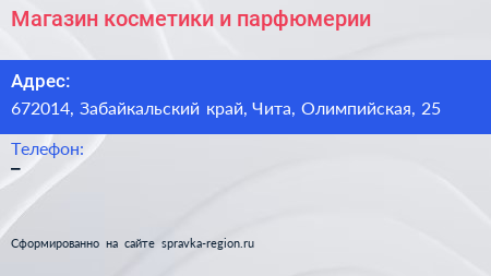 Магазин косметики и парфюмерии по адресу 672014, Забайкальский край, Чита, Олимпийская, 25 в дальнейшем Организация, размещена в следующих категориях: