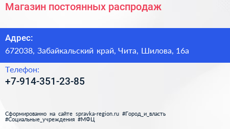 Магазин постоянных распродаж по адресу 672038, Забайкальский край, Чита, Шилова, 16а в дальнейшем Организация, размещена в следующих категориях:
