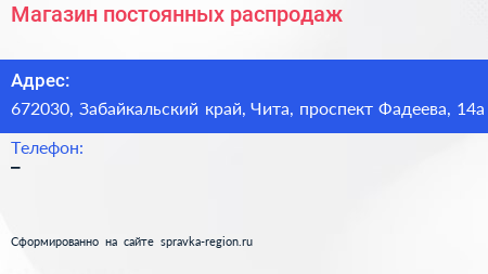 Магазин постоянных распродаж по адресу 672030, Забайкальский край, Чита, проспект Фадеева, 14а в дальнейшем Организация, размещена в следующих категориях: