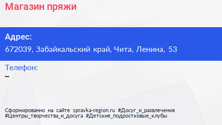 Магазин пряжи по адресу 672039, Забайкальский край, Чита, Ленина, 53 в дальнейшем Организация, размещена в следующих категориях: