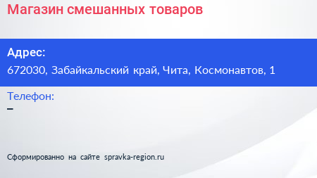 Магазин смешанных товаров по адресу 672030, Забайкальский край, Чита, Космонавтов, 1 в дальнейшем Организация, размещена в следующих категориях: