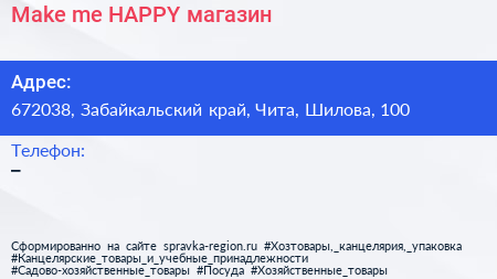 Make me HAPPY, магазин по адресу 672038, Забайкальский край, Чита, Шилова, 100 в дальнейшем Организация, размещена в следующих категориях: