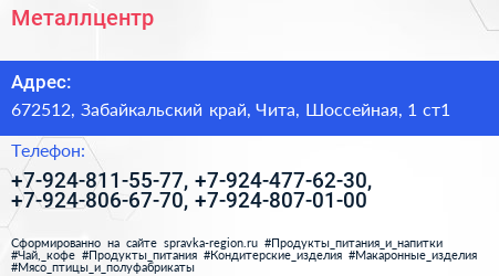 Металлцентр по адресу 672512, Забайкальский край, Чита, Шоссейная, 1 ст1 в дальнейшем Организация, размещена в следующих категориях: