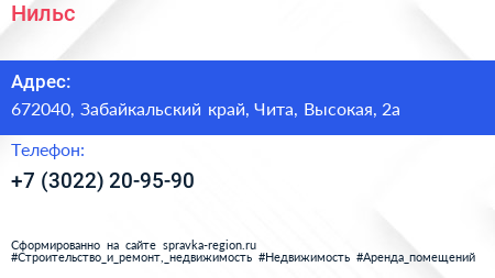 Нильс по адресу 672040, Забайкальский край, Чита, Высокая, 2а в дальнейшем Организация, размещена в следующих категориях: