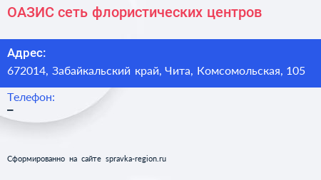 ОАЗИС, сеть флористических центров по адресу 672014, Забайкальский край, Чита, Комсомольская, 105 в дальнейшем Организация, размещена в следующих категориях: