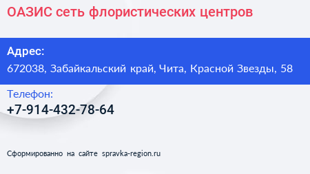 ОАЗИС, сеть флористических центров по адресу 672038, Забайкальский край, Чита, Красной Звезды, 58 в дальнейшем Организация, размещена в следующих категориях: