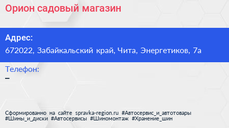 Орион, садовый магазин по адресу 672022, Забайкальский край, Чита, Энергетиков, 7а в дальнейшем Организация, размещена в следующих категориях: