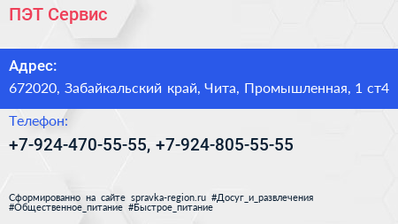 ПЭТ-Сервис по адресу 672020, Забайкальский край, Чита, Промышленная, 1 ст4 в дальнейшем Организация, размещена в следующих категориях: