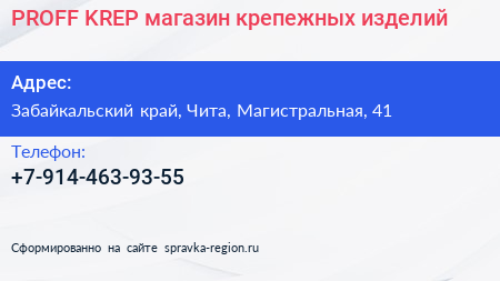 PROFF-KREP, магазин крепежных изделий по адресу Забайкальский край, Чита, Магистральная, 41 в дальнейшем Организация, размещена в следующих категориях: