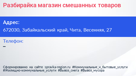 Разбирайка, магазин смешанных товаров по адресу 672030, Забайкальский край, Чита, Весенняя, 27 в дальнейшем Организация, размещена в следующих категориях: