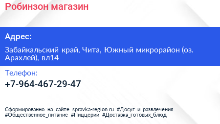Робинзон, магазин по адресу Забайкальский край, Чита, Южный микрорайон (оз. Арахлей), вл14 в дальнейшем Организация, размещена в следующих категориях: