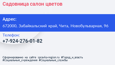 Садовница, салон цветов по адресу 672000, Забайкальский край, Чита, Новобульварная, 96 в дальнейшем Организация, размещена в следующих категориях: