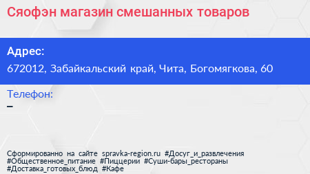 Сяофэн, магазин смешанных товаров по адресу 672012, Забайкальский край, Чита, Богомягкова, 60 в дальнейшем Организация, размещена в следующих категориях: